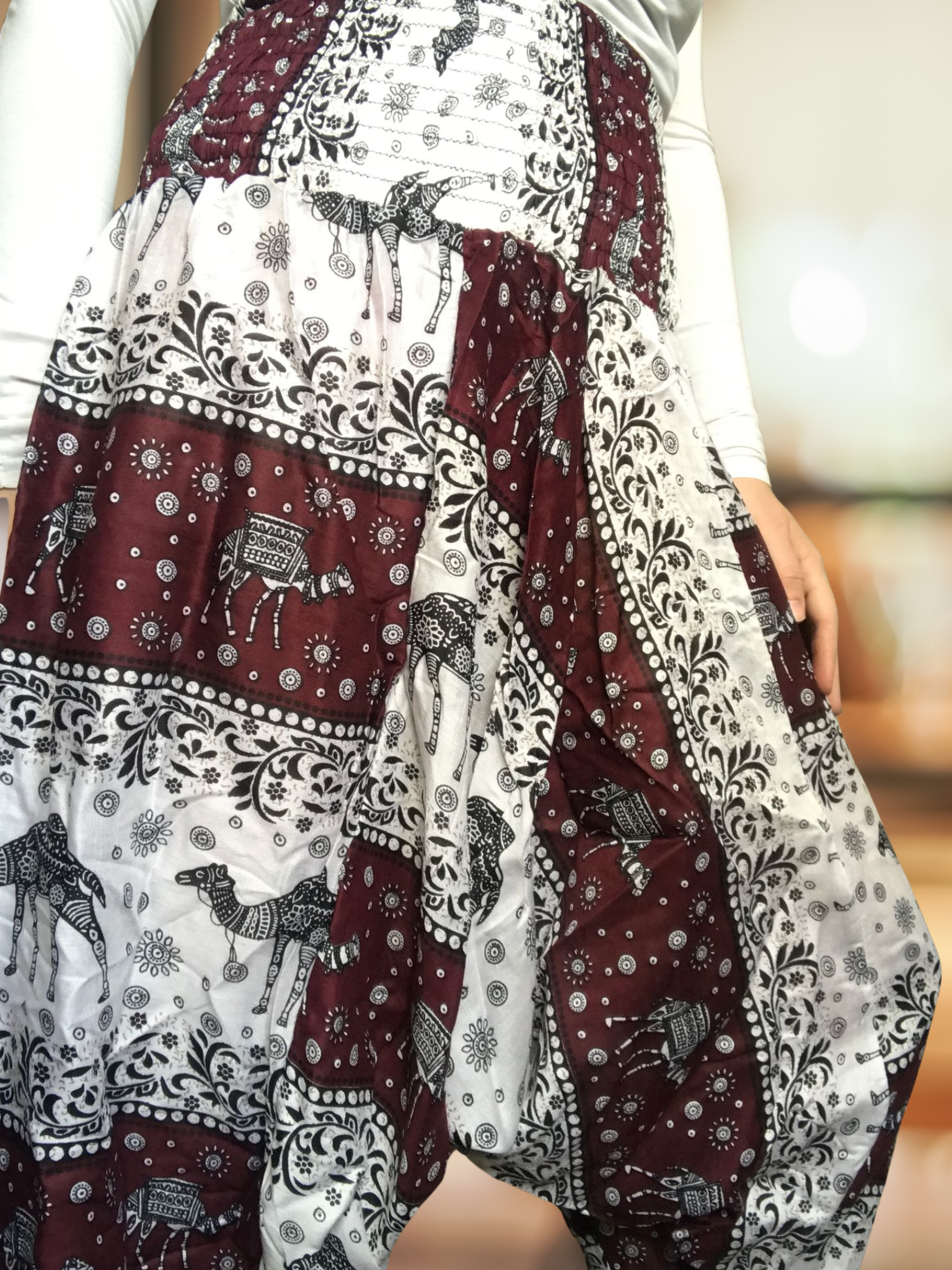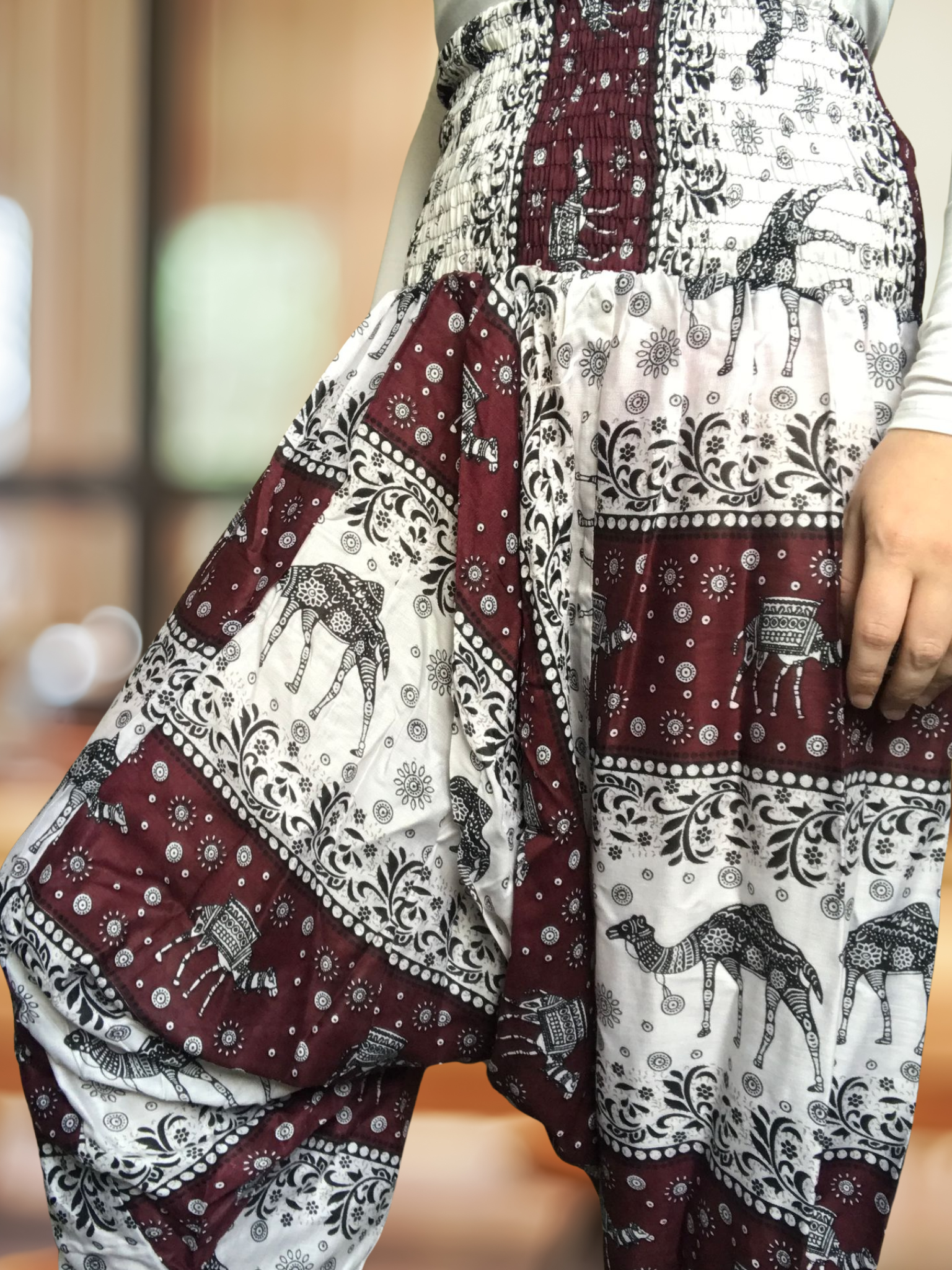 Be the first to review “Burgundy Camel Print Harem Trousers”